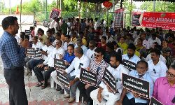 AP JAC Amaravati committee members and CPS employees staging a protest at dharna chowk in Vijayawada on Monday ( Hans photo Ch Venkata Mastan )