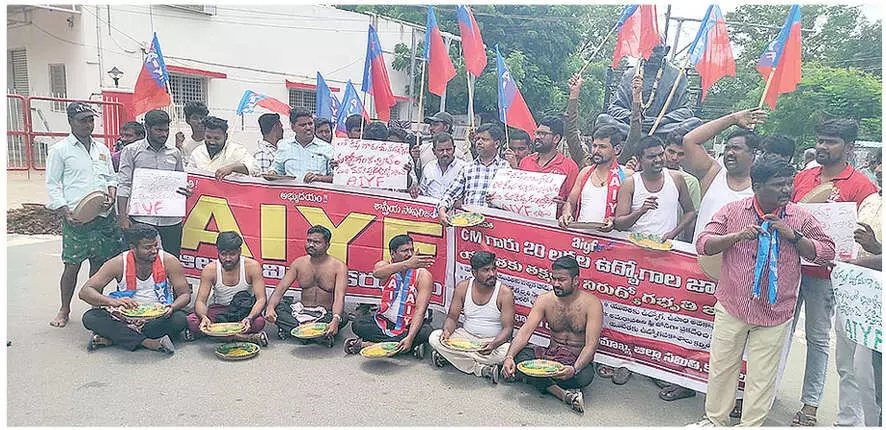 Kurnool: The All India Youth Federation (AIYF) on Monday staged a dramatic protest in front of the Kurnool District Collectorate, demanding the immediate release of job notifications and implementation of the promised unemployment allowance. The protest, led by AIYF District Secretary K. Srinivasulu, saw youth activists demonstrating half-naked and holding empty food plates, highlighting their distress over unfulfilled electoral promises.