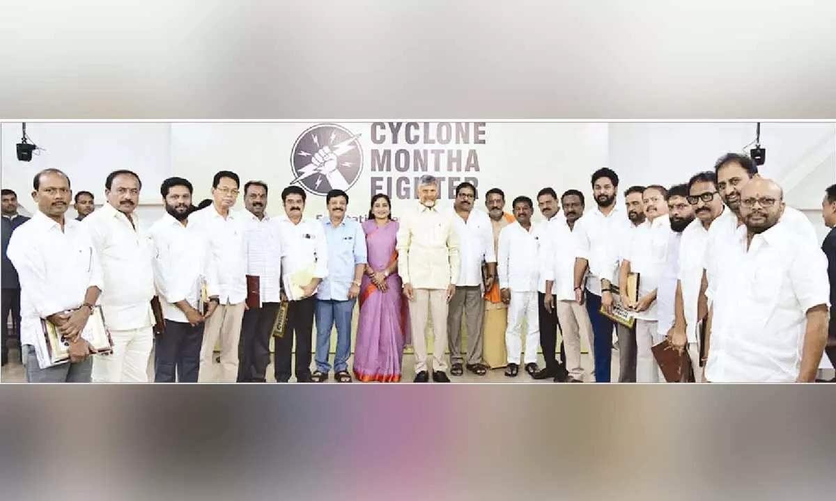 Chief Minister N Chandrababu Naidu with ministers and officials felicitated for their work during Cyclone Montha at his camp office in Undavalli on Saturday