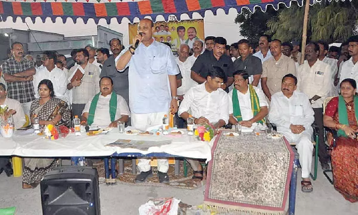 Agriculture Minister K Atchannaidu addressing a meeting in Sattenapalli on Tuesday. Narasaraopet MP Lavu Sri Krishadevarayulu, MLA Kanna Lakshminarayana, Marketing director Vijaya Suneetha are also seen.