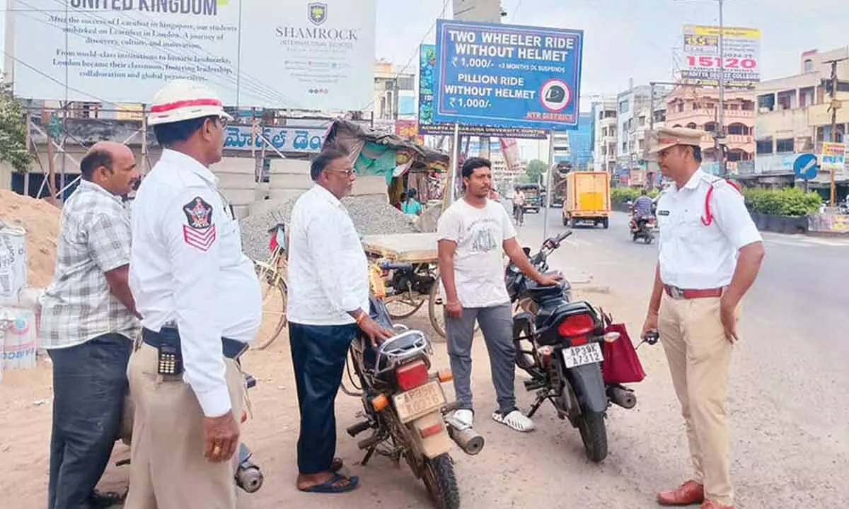 Vijayawada: Traffic police of the NTR District Police Commissionerate conducted a special awareness drive for two-wheeler riders on the importance of wearing helmets, as part of efforts to improve road safety and reduce accidents in the city.