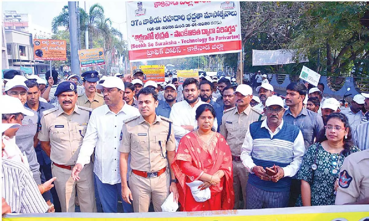 Kakinada: As part of the 37th National Road Safety Month, a walkathon was organised in Kakinada on Tuesday under the joint auspices of the Transport and Police Departments. Kakinada District In-charge Collector Apurva Bharat and District SP Bindu Madhav flagged off the event.
