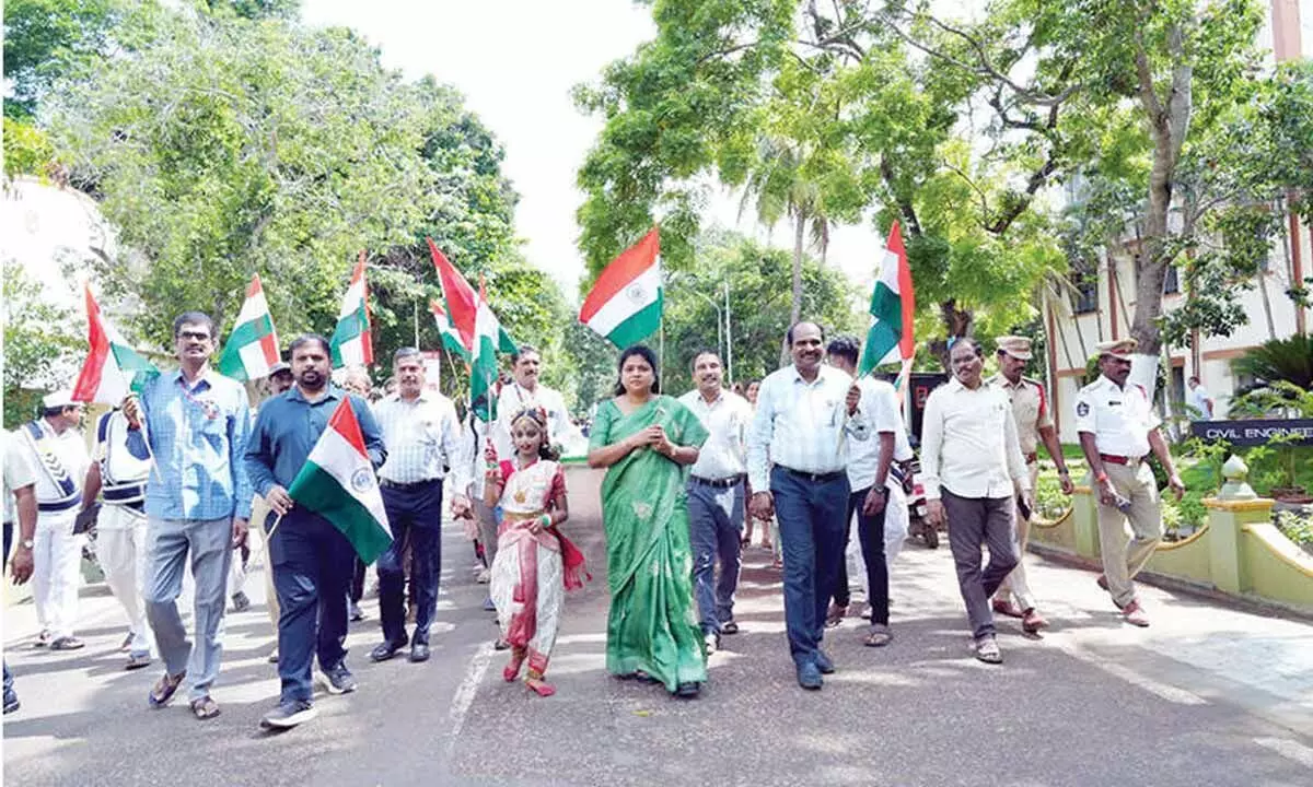 Collector Chadalavada Nagarani leading the Har Ghar Tiranga campaign along with SRKR Engineering College staff in Bhimavaram on Monday