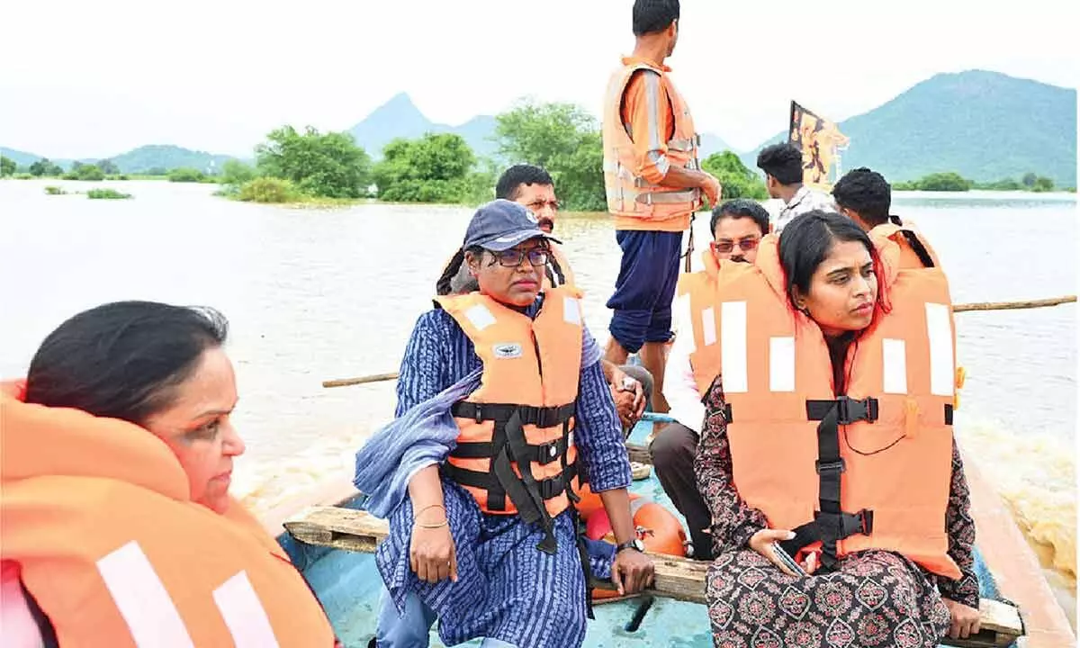 She further mentioned that residents from the flood-affected villages of Kommu Gudem and Lachhu Gudem in Kukkunoor mandal have been relocated to Dacharam relief camp using tractors. In Kukkunoor mandal, six residential areas across three villages have been completely cut off due to the Godavari floods. Similarly, in Velairupadu mandal, 13 residential areas across 23 villages are disconnected from the outside world.