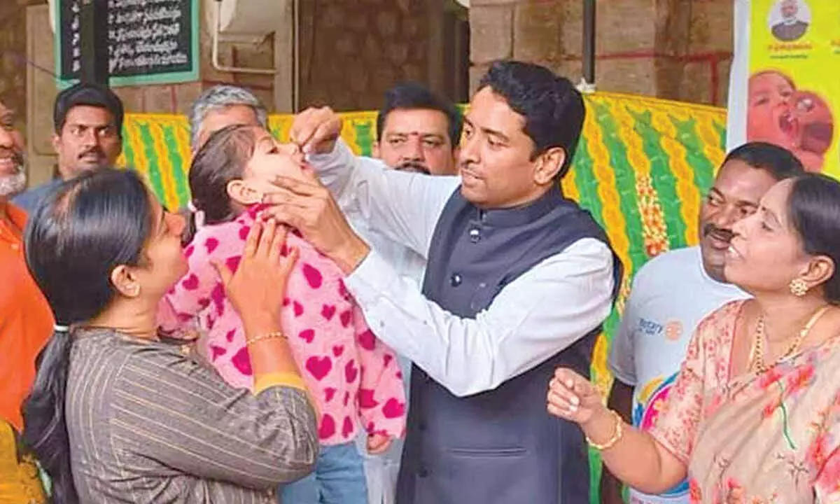 Meanwhile, in Krishna district, district collector DK Balaji also participated in the Pulse Polio programme. He visited Sri Panduranga Municipal High School at Chilakalapudi and personally administered polio drops to children. Accompanied by his wife Prudhvi, he also administered the drops to his son, setting an example. During the visit, he noticed a dental issue in a child and immediately directed health officials to ensure proper treatment.
