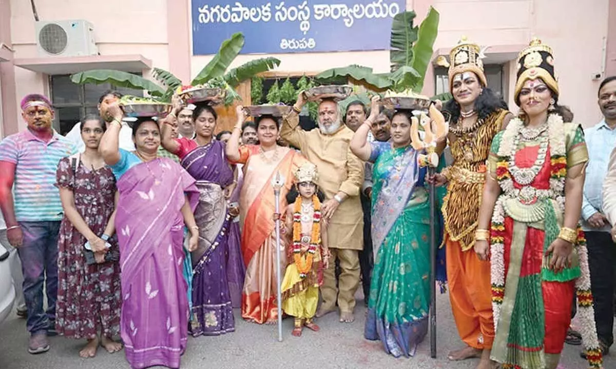 Tirupati: The commissioner Narapureddy Mourya presented sareee on behalf of Tirupati municipal Corporation on Monday to goddess Gangamma, on Jathara.