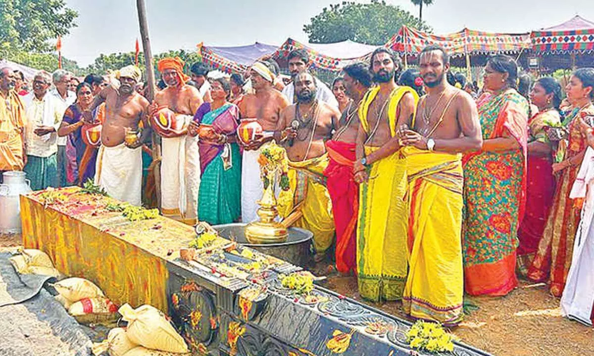 Earlier, Vedic scholars performed a series of sacred rituals for Vimana Shikhara and Dhwajastambham.