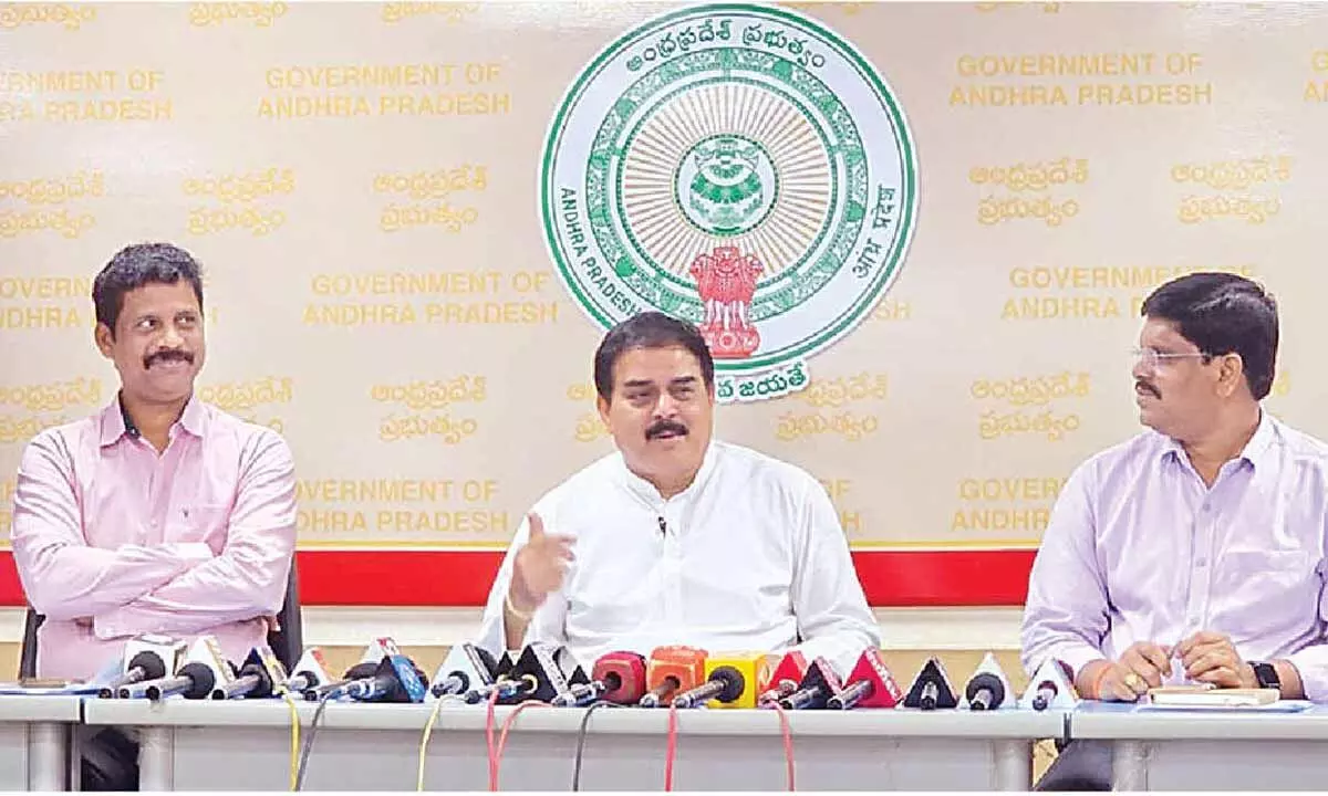 Civil supplies minister Nadendla Manohar speaking to media at Civil Supplies Bhavan in Vijayawada on Wednesday