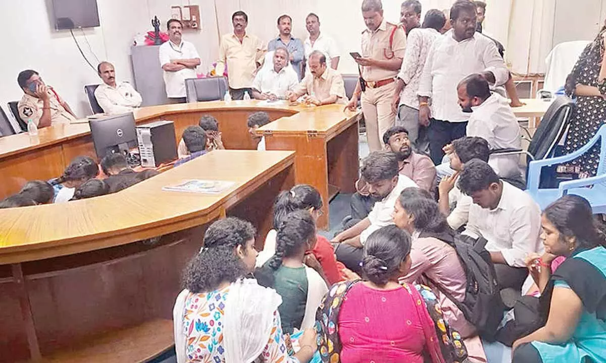 Students protesting in SVU rector’s chamber on Monday. Rector Prof Ch Appa Rao and registrar Prof M Bhupathi Naidu are also seen.