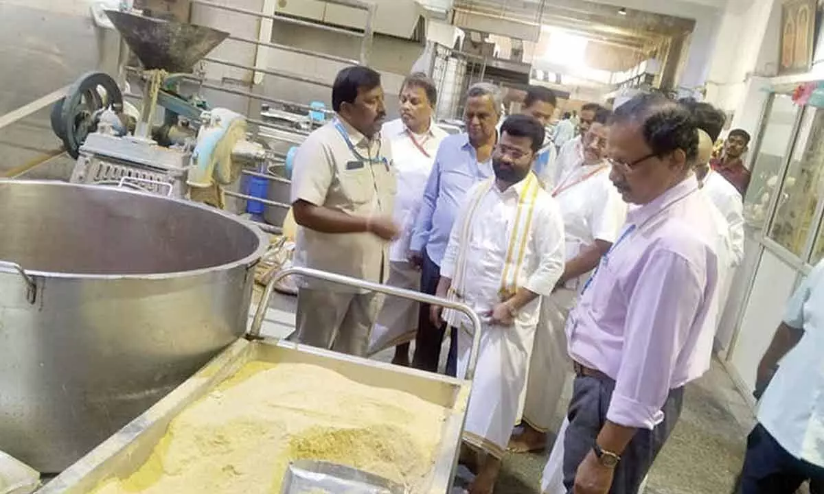 The study committee visit was conducted under the guidance of temple executive officer V K Seena Naik, following directives from endowments minister Anam Ramanarayana Reddy and commissioner K Ramachandra Mohan. The initiative underscores the administration’s commitment to enhancing devotees’ experience and ensuring the highest quality in all aspects of prasadam service. During the visit, the team first met TTD additional executive officer (EO) Ch Venkaiah Chowdary and offered the Goddess Durga Devi prasadam. They then toured the main laddu preparation facility (Potu), closely observing the machinery, raw materials, and preparation techniques to ensure the highest quality.