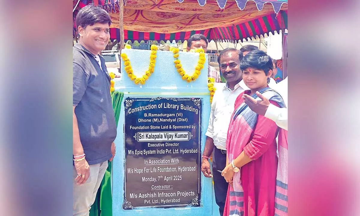 A new, well-equipped library is being built in B Ramadurgam village, in Dhone mandal, with substantial investment and modern amenities. Foundation stone ceremony was held with the support of Ram Anjaneyulu, Chairman of Ashish Infra Projects Pvt. Ltd, while Vijay Kumar, Executive Director of Epiq Systems India Pvt. Ltd., and Dr Himaja, Founder and Chairperson of Hope for Life Foundation, also participated in the programme on Wednesday.The organisers informed that library construction would be completed within three months and will be made accessible to the public soon after. They stressed that the library will be particularly beneficial to students preparing for competitive exams in and around Ramadurgam village, as it will be stocked with all necessary books and materials to aid their preparation.