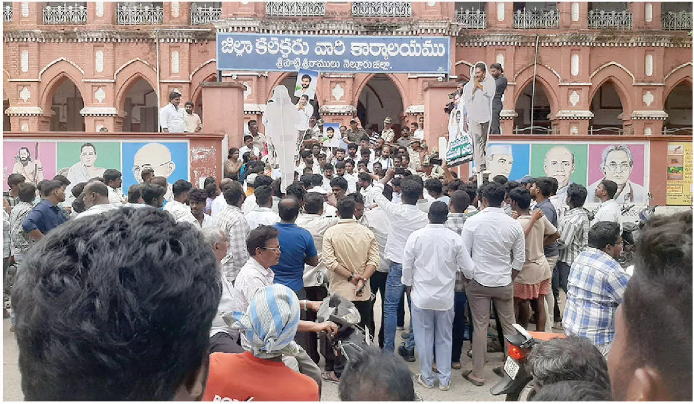 YSRCP Nellore city in-charge and MLC Parvathareddy Chandrasekhar Reddy flagged off the rally at old ZP office, which concluded at the Collectorate. Later, the protesters staged a dharna in front of the collectorate, protesting against the government’s failure in implementing assurances given to the youth during 2024 electioneering.