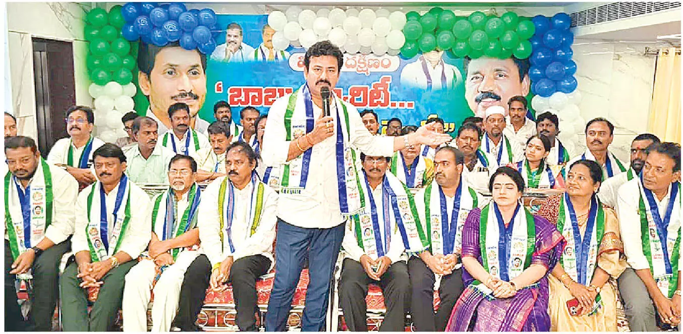 YSRCP district president K K Raju speaking at ‘Babu Surety-Mosalu Guarantee’ programme in Visakhapatnam on Tuesday