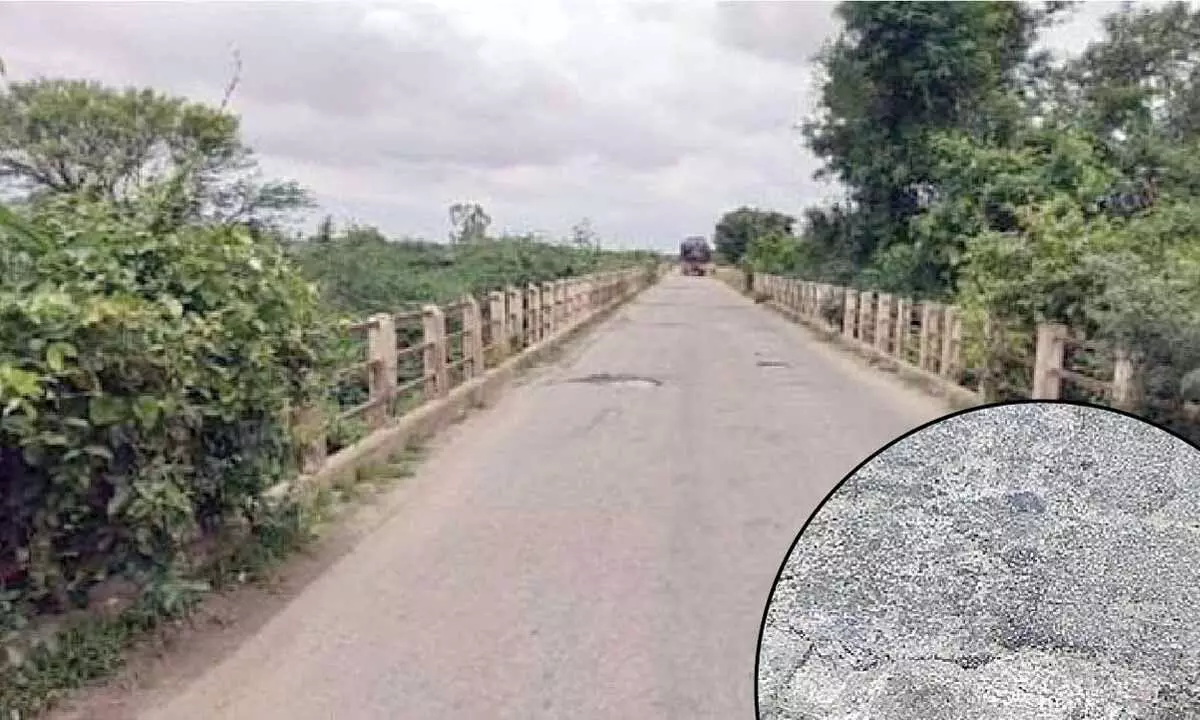 Devanakonda: The bridge connecting Alarudinne and Valigonda villages in Devanakonda mandal of Kurnool district has once again turned perilous for commuters, as large potholes have reappeared on its surface—barely six months after the Roads and Buildings (R&B) department undertook repair works.