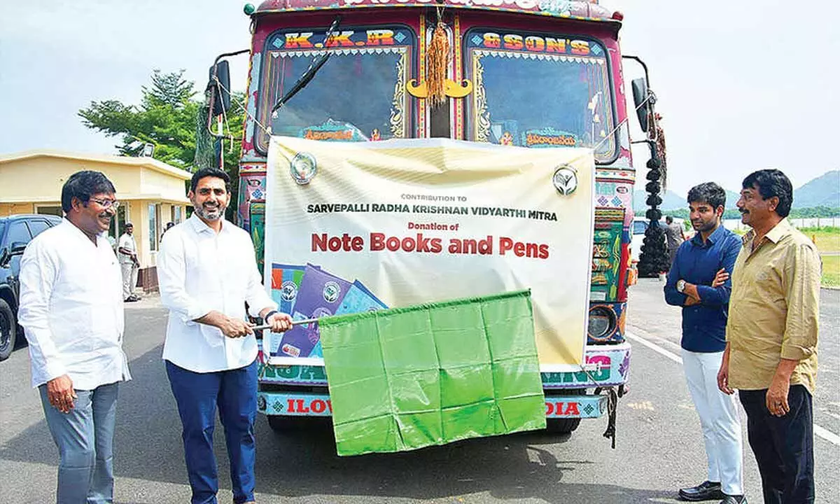 The distribution of notebooks was formally launched by Minister for Education and IT Nara Lokesh, who flagged off the truck carrying the donated materials.
