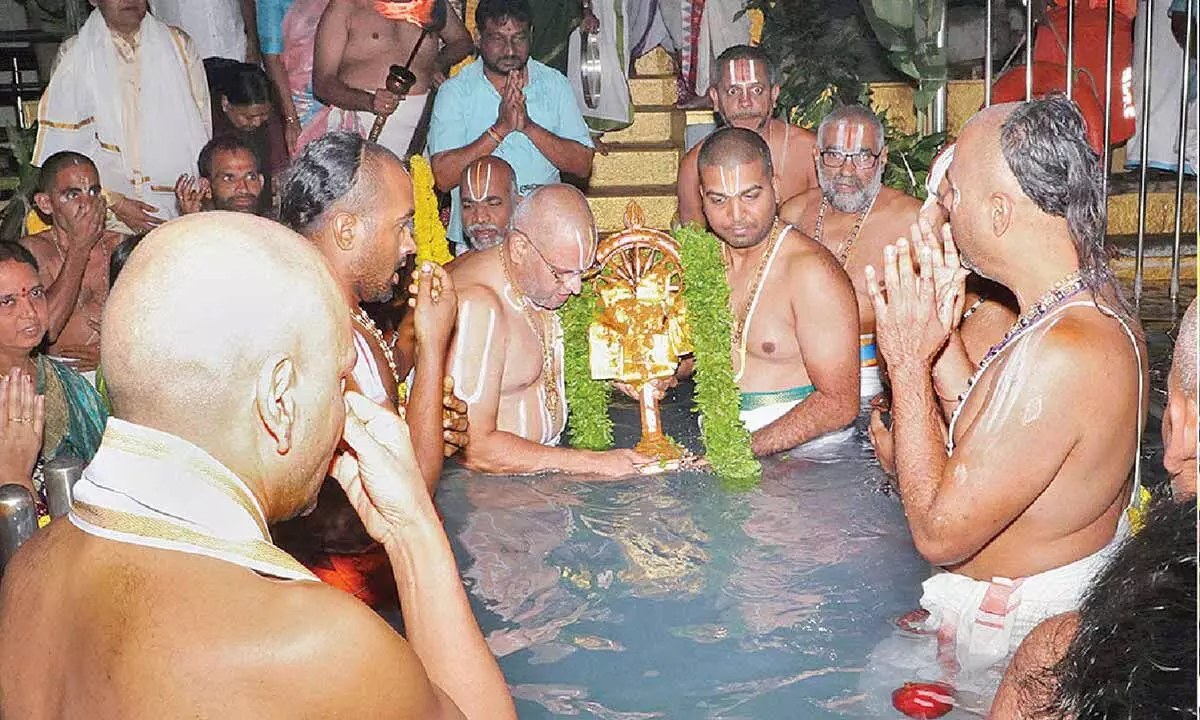 As part of the ritual, Sri Sudarshana Chakrathalwar was taken in a ceremonial procession to Swami Pushkarini. The traditional Chakrasnanam was conducted there as per temple scriptures. TTD executive officer Anil Kumar Singhal, additional EO Ch Venkaiah Chowdary and other temple officials took part in the ceremony.