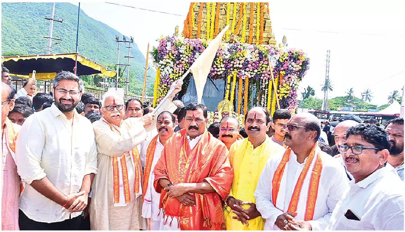 The pushparatham was flagged off by the hereditary trustee of the temple, Pusapati Ashok Gajapathi Raju and MLAs Ganta Srinivasa Rao and PGVR Naidu.