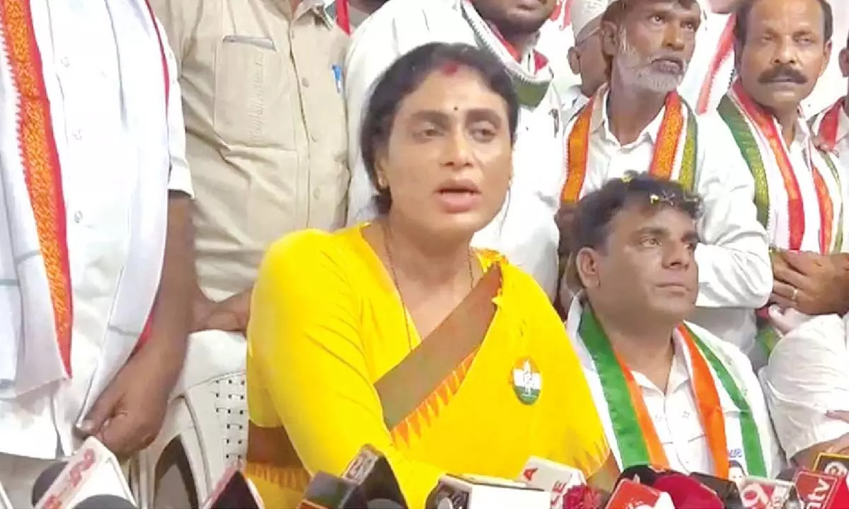 APCC Chief YS Sharmila Reddy speaking to the media in Vijayawada on Thursday