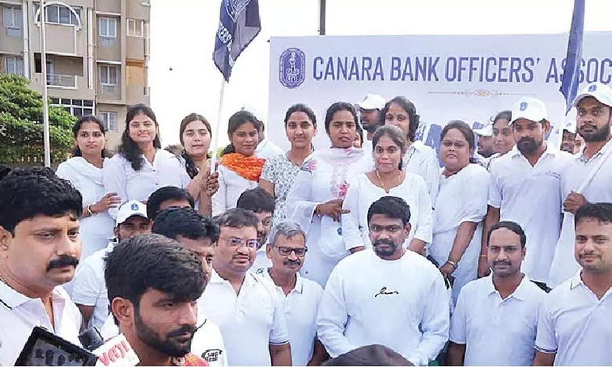 Visakhapatnam: Wi tha slogan ‘unity is our strength’, the Canara Bank Officers’ Association organised a unity march along the Beach Road in Visakhapatnam.