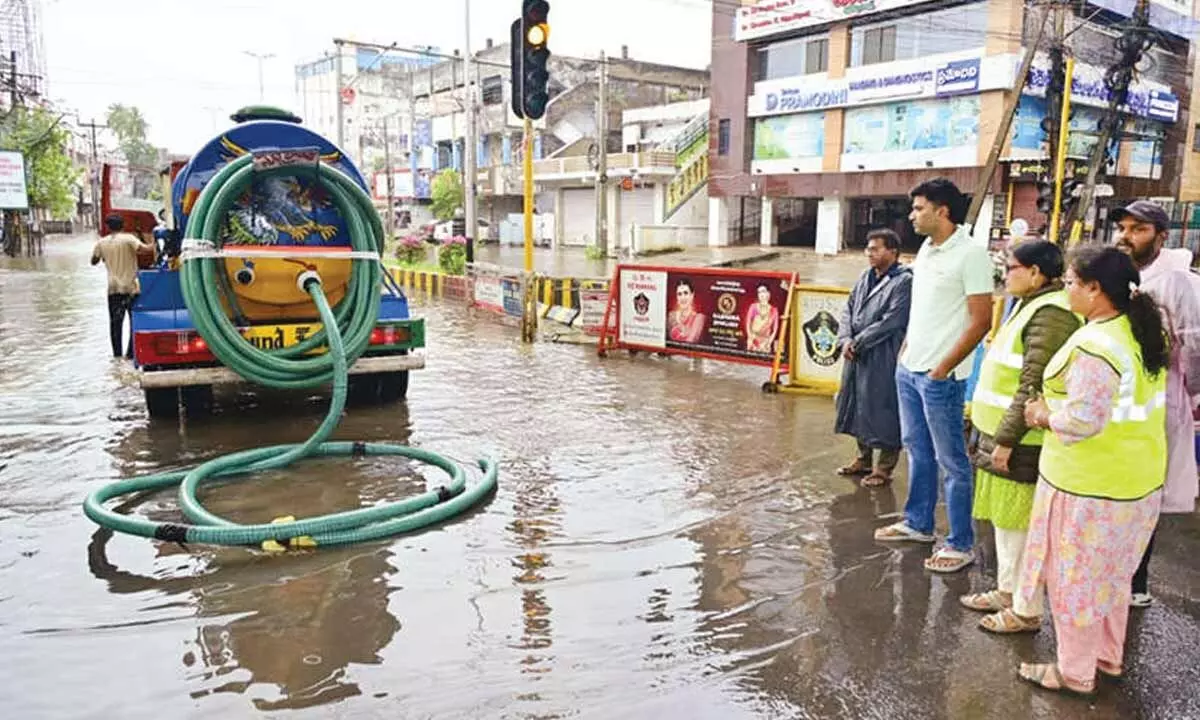 Vijayawada: Vijayawada Municipal Corporation (VMC) Commissioner HM Dhyanachandra said that measures are being taken across the city to prevent rainwater accumulation on roads following heavy rains caused by Cyclone Montha. On Wednesday morning, the Commissioner inspected several key areas, including Bandar Road, Loyola College Road, Jammi Chettu Centre, Siddhartha College Road, ESI Road, Eluru Road, Bus Stand National Highway, Bharathi Nagar, and Fortune Murali Park Road, to review the situation at the field level.