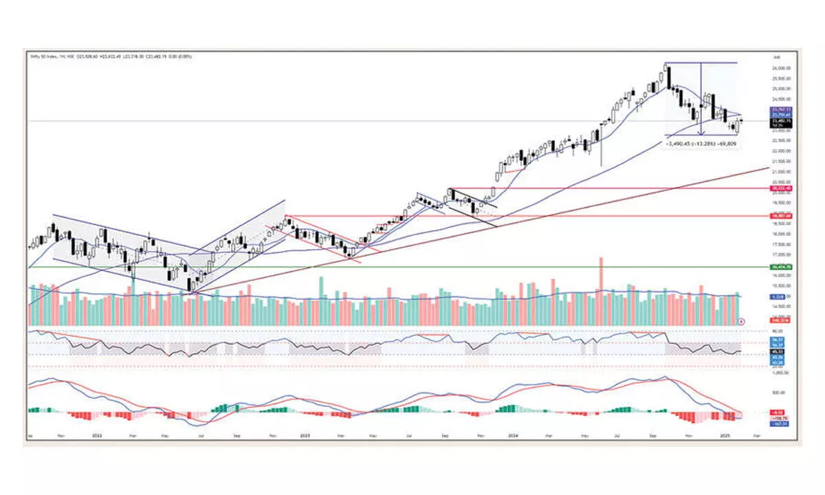 The Index opened with a gap down on Monday and formed a lower low. It was corrected by 13.28 per cent and completed the Category-1 correction, which we have been mentioning for the last two months. Now, it is important that the bullish engulfing candle must get a confirmation for its implications by closing above it. This means the Nifty must close above the 23,633 level. It is also the 200EMA (23,621) level. The Index faced resistance on Saturday at this long-term average. Above this, the 50DMA is at 23,809 points, and the 200DMA is at 24,005 points, which are the important resistance points. For a trend reversal, the Nifty must clear all these resistance points.