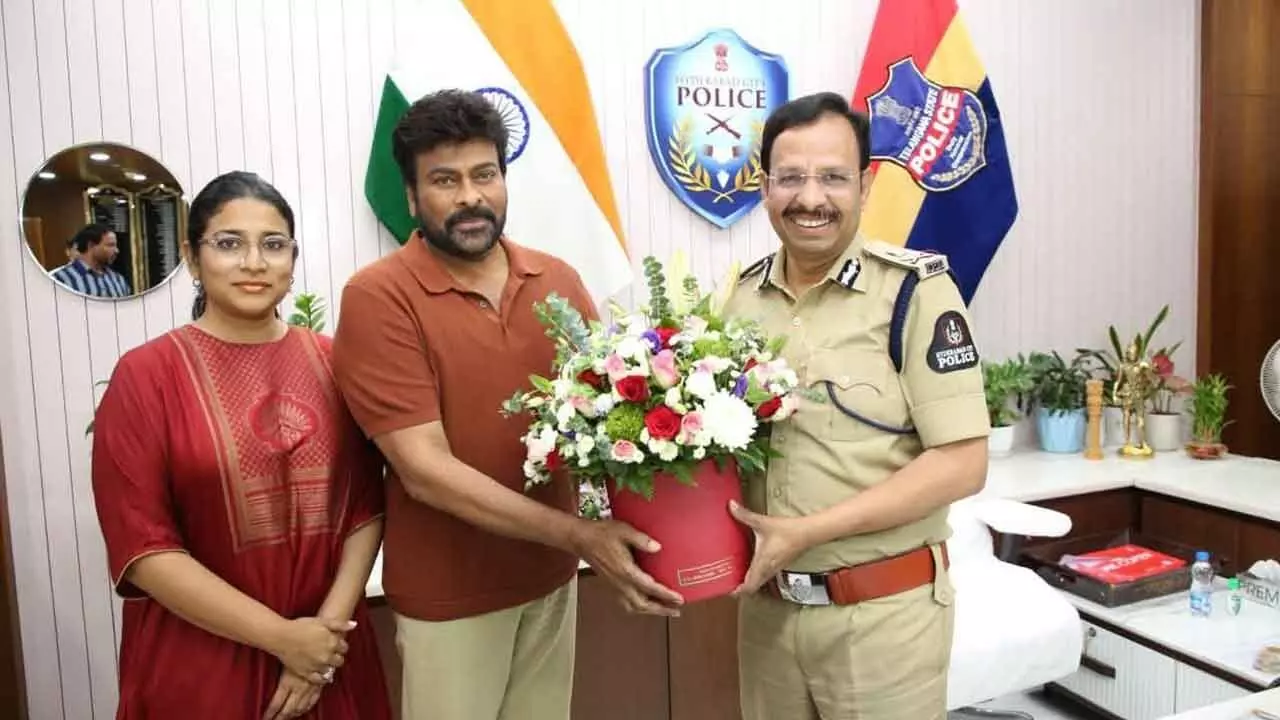 Megastar Chiranjeevi paid a courtesy call on Hyderabad Police Commissioner VC Sajjanar. He met Sajjanar, presented him with a bouquet of flowers, and wished him well on his recent assumption of office as Hyderabad CP.