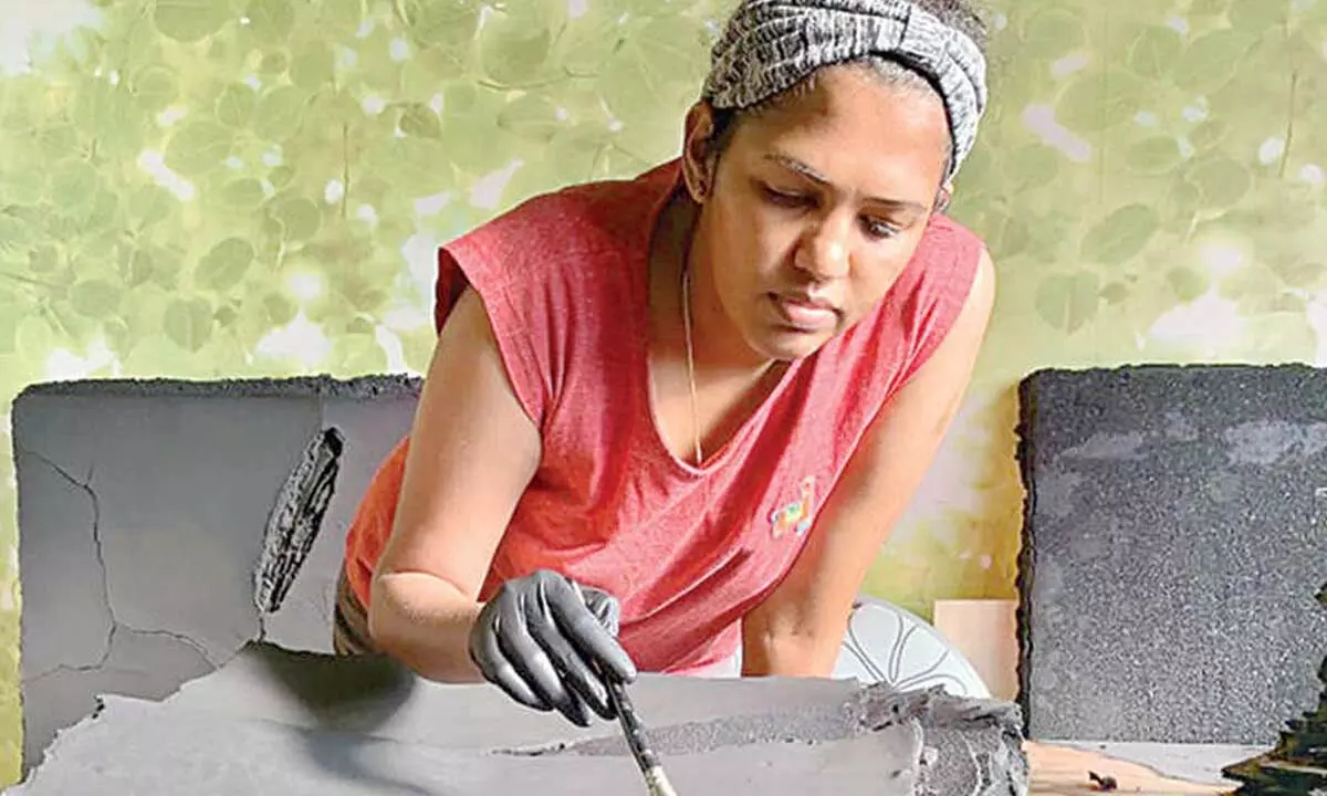 Mahalakshmi’s work employs charcoal, black lime plaster, and wood to create layered textures that capture the delicate balance between stability and change, presence and absence, and the continuous cycles of growth and renewal. Her pieces often evoke black landscapes with smooth planes, intricate surface textures, and rugged crevices. Using a meticulous process of grinding charcoal into powder and blending it with glue, she creates works that reflect life’s unpredictability, irregularity, and layered complexity.