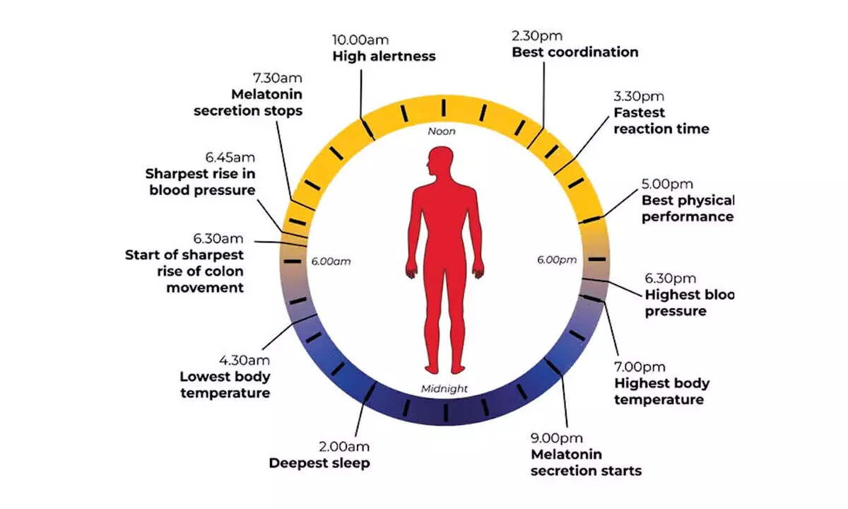 Your body has a natural 24-hour clock that regulates hormones, body temperature and when you feel most awake or ready for sleep. This clock is called your circadian rhythm. It is controlled by the brain but can also be influenced by external factors such as sunlight. This might explain why exercising in the morning in winter can be especially hard for some of us. Research shows your circadian rhythm is clearly linked to exercise performance, which tends to follow a daily pattern. Most people reach their peak between 4 and 7 pm. This means we tend to be stronger, faster and more powerful in the afternoon and early evening. We don't know exactly why. But there are a few potential explanations.