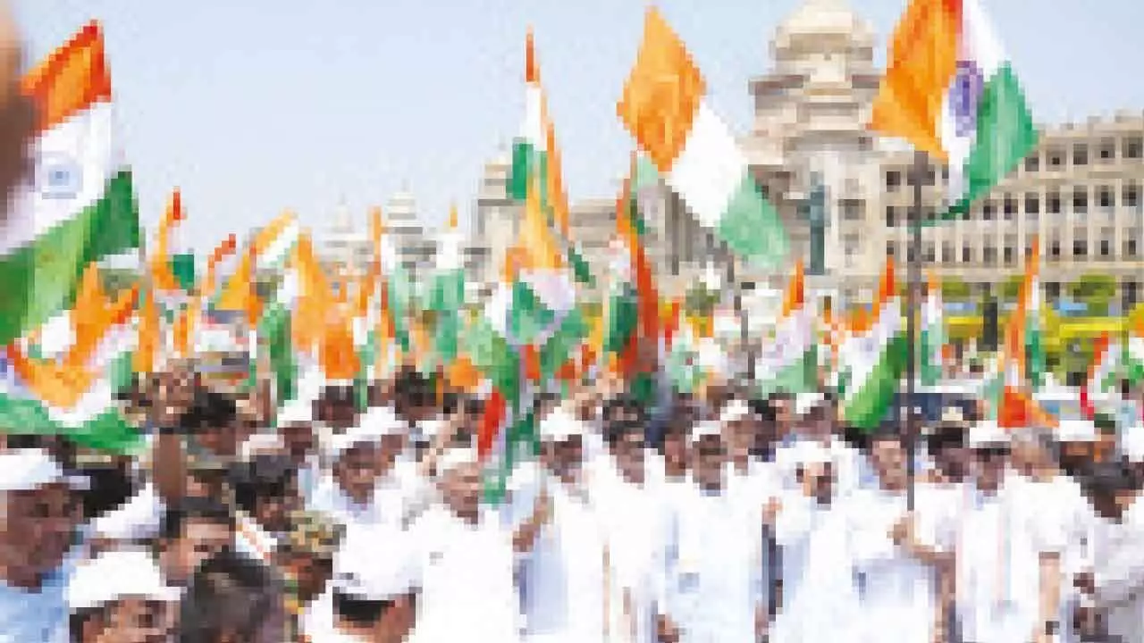 The ‘Jai Hind Yatra’ by the Congress took place from K.R. Circle to Minsk Square in Bengaluru, under the leadership of Karnataka Chief Minister Siddaramaiah and Deputy Chief Minister D.K. Shivakumar.