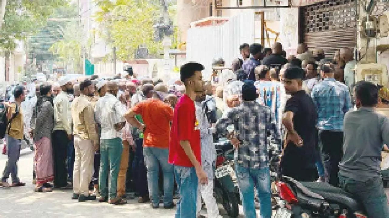 Hyderabad: The residents of Chandulal Baradari in Old City seem frustrated over the gathering of hundreds of men for the alleged application of a miraculous medicine for the hair regrowth. A man was seen applying a lotion on bald heads for free, claiming his treatment could help hair regrowth. The offer drew large crowds, with people queuing up for their turn. Due to this, the main road was completely blocked over the past few days, which paralysed traffic.