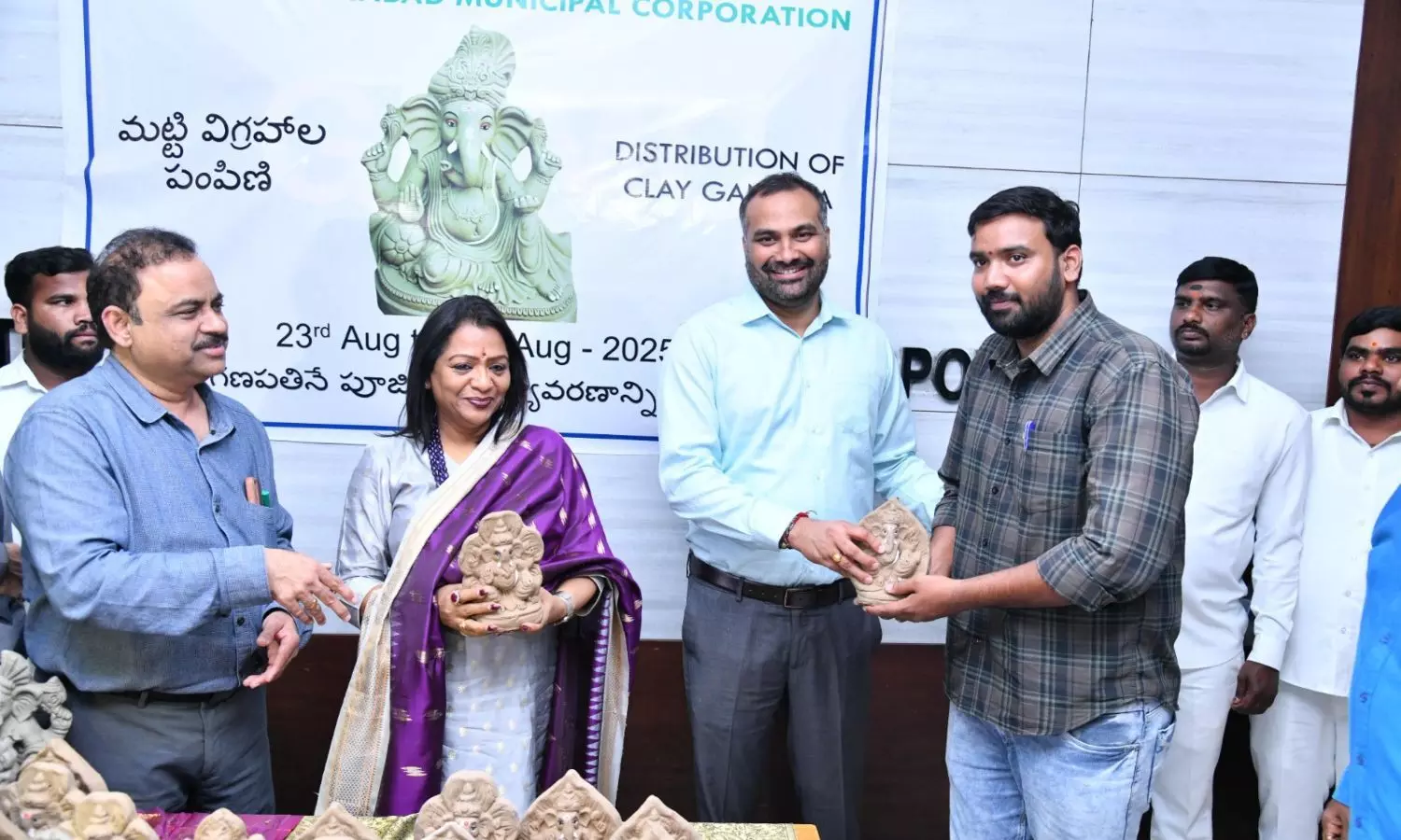 Mayor Gadwal Vijayalakshmi and Commissioner R.V. Karnan distributed the idols at the GHMC Head Office.