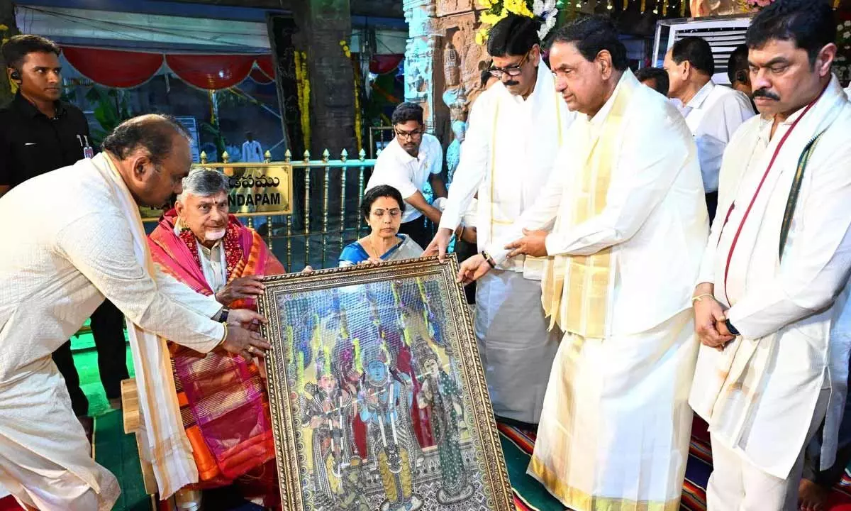 Chief Minister N Chandrababu Naidu, accompanied by his wife Bhuvaneswari, took part in the sacred event. In keeping with tradition, they offered Mutyala Talambralu and silk robes on behalf of the Andhra Pradesh government to the divine couple. The Chief Minister and his wife witnessed the complete proceedings of the celestial wedding with reverence.