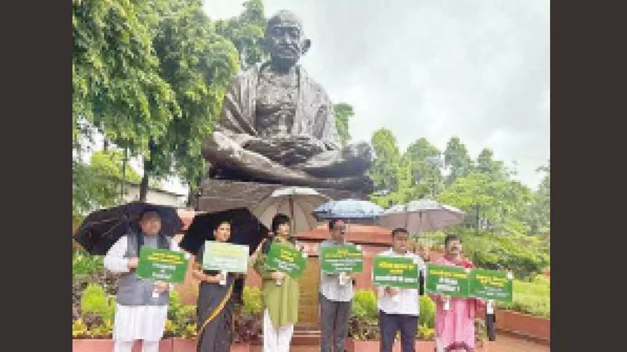 New Delhi: Biju Janata Dal (BJD) MPs staged a protest at the Gandhi statue in Parliament on Tuesday, decrying the alleged deteriorating law and order situation in BJP-ruled Odisha, particularly the surge in crimes against women and children.