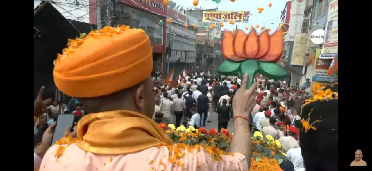 Holding lotus symbols and party flags, lakhs of supporters marched alongside the Chief Minister, raising slogans such as “NDA Gathbandhan Zindabad” and “Prime Minister Narendra Modi Zindabad.” The crowd showered Yogi Adityanath with flowers, while others welcomed him with sparklers and firecrackers along the route.