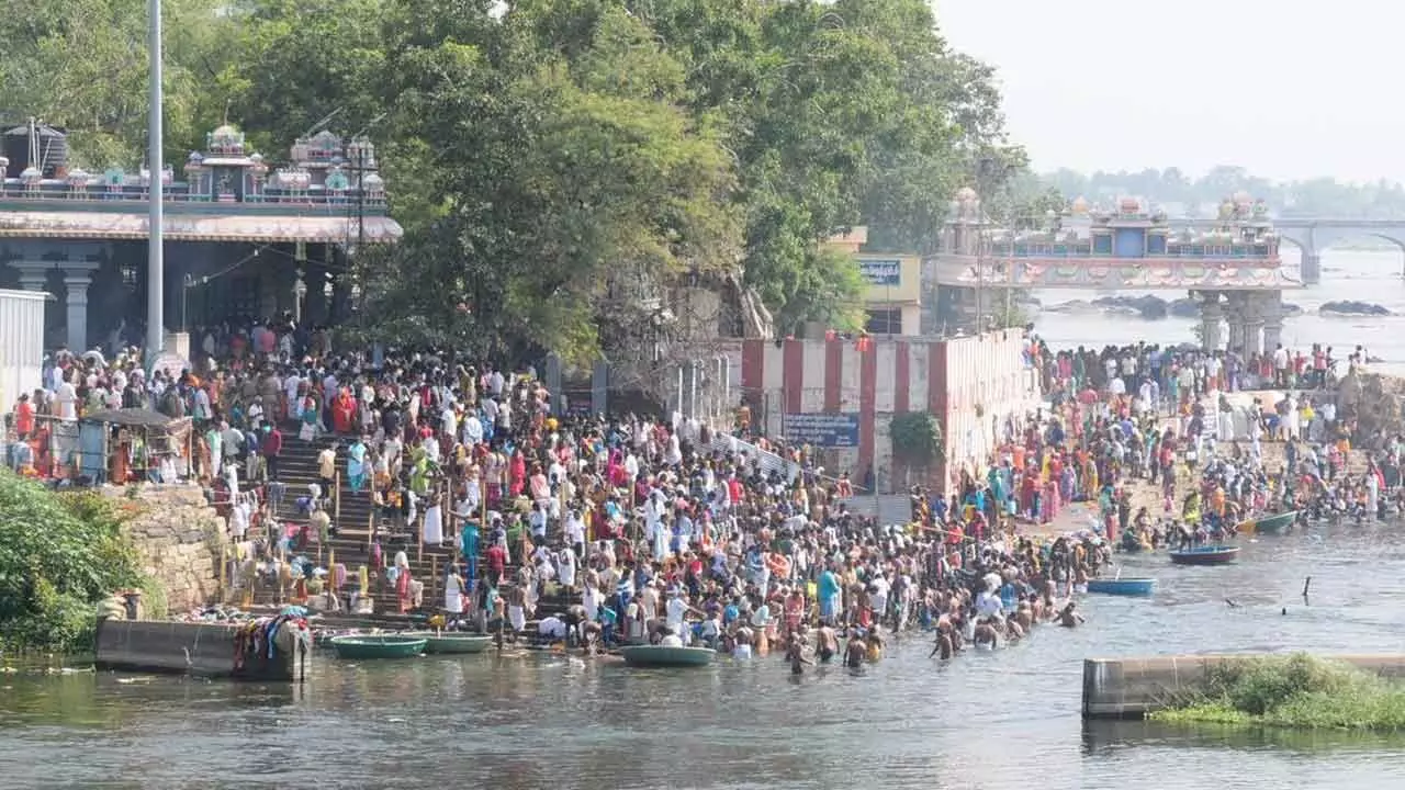 Similar large gatherings were reported at Kodumudi, where devotees took a holy dip in the Cauvery and offered prayers at the Siva, Vishnu, and Brahma temples, all situated within the same premises.