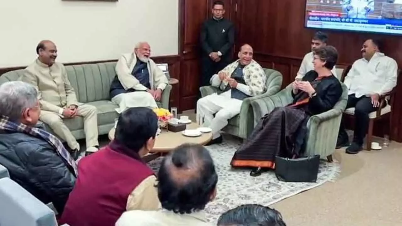 NEW DELHI: Prime Minister Narendra Modi, Congress MP Priyanka Gandhi Vadra, Nationalist Congress Party-Sharadchandra Pawar's Supriya Sule and other leaders met Lok Sabha Speaker Om Birla in his chamber after the Winter Session of Parliament was adjourned sine die on Friday.