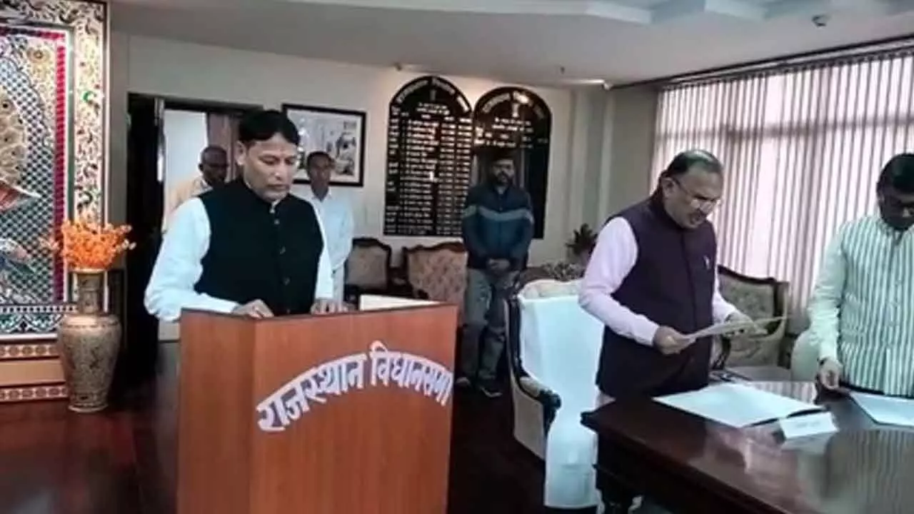 Jaipur: Rajasthan Assembly Speaker Vasudev Devnani on Tuesday administered the oath to newly elected Congress MLA Pramod Jain Bhaya, an official spokesperson said. Bhaya took the oath in Hindi in the speaker’s chamber. Extending his greetings, Speaker Devnani congratulated the newly elected member.
