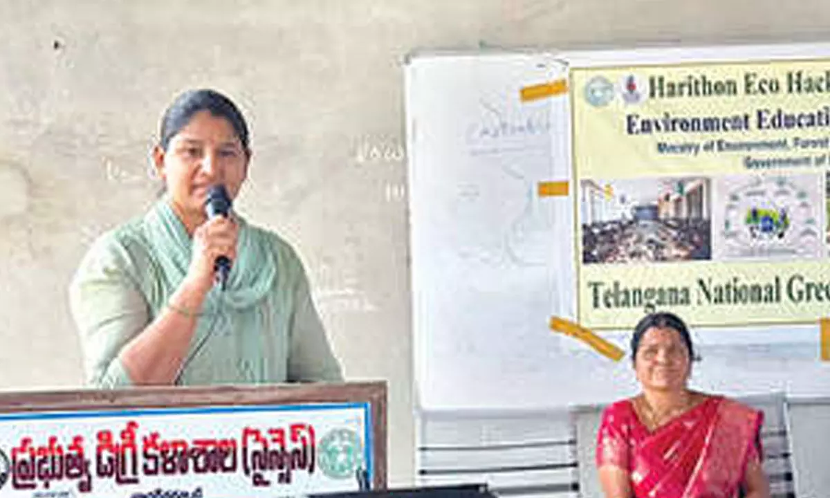 Nagarkurnool: Anawareness seminar on e-waste was conducted at the Government Science Degree College, Nagarkurnool district headquarters, under the aegis of the Telangana National Green Corps as part of the Harithon Eco Hackathon. The programme was organized with a special focus on environmental protection. National Green Corps Resource Person Chaitanya attended as the chief guest and addressed the students.