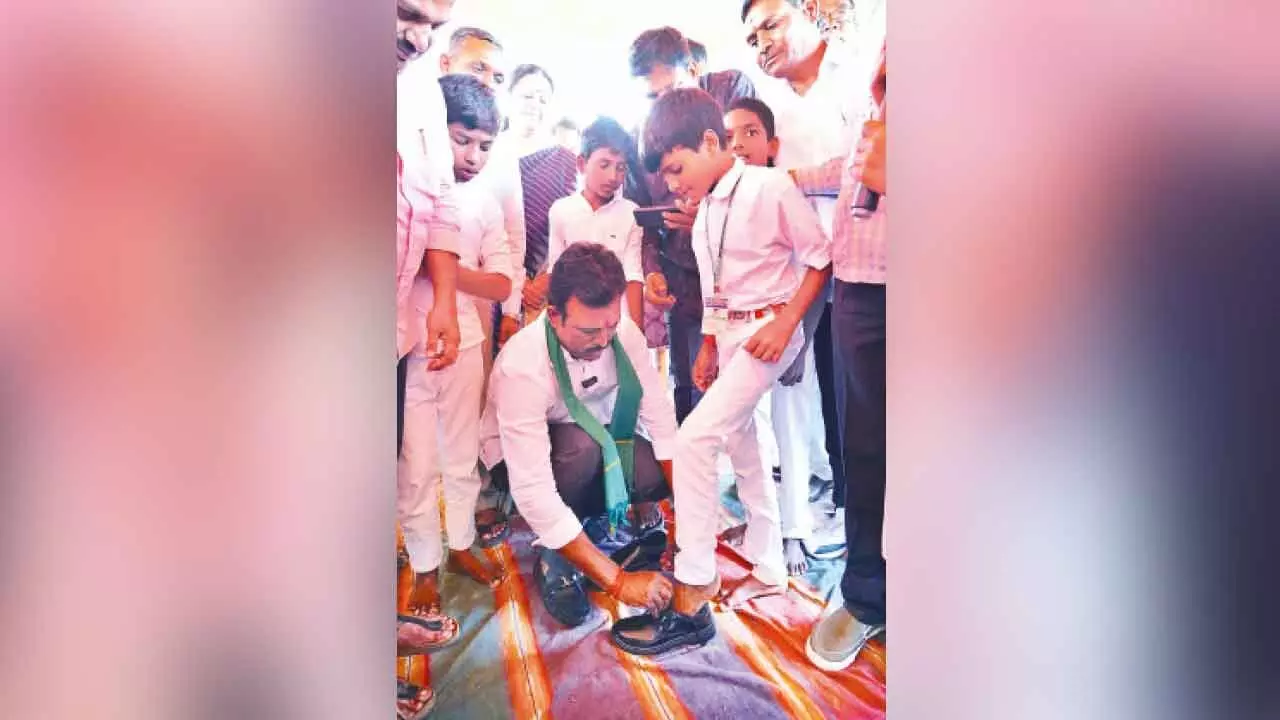 Devarkadra MLA G Madhusudhan Reddy helps a child put on shoes in Musapet