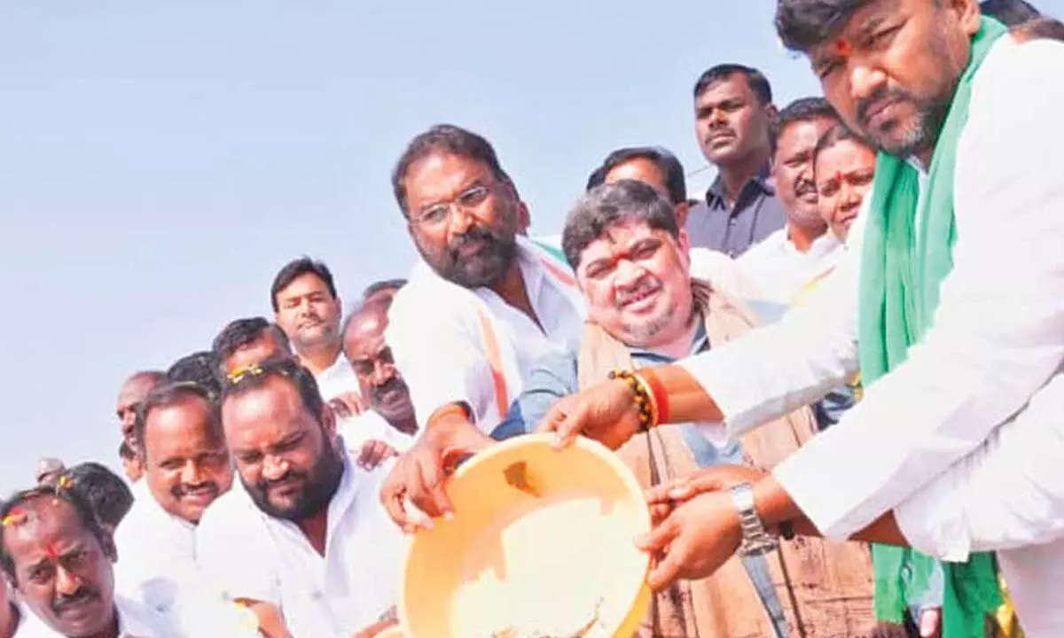 Srihari, accompanied by Minister Ponnam Prabhakar and Fisheries Corporation Chairman Mettu Sai Kumar, launched 3 lakh fish seedlings valued at Rs 5.17 lakh at Yellamma Lake in the Husnabad Assembly constituency of Siddipet district on Saturday.