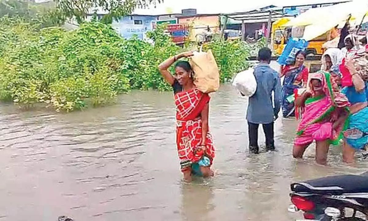 Asifabad: Heavy rains lashed the district headquarters on Saturday. The rain that started after 2 pm continued till 4 pm. Due to this, many canals were flooded. The Jubilee Market area was filled with rainwater.