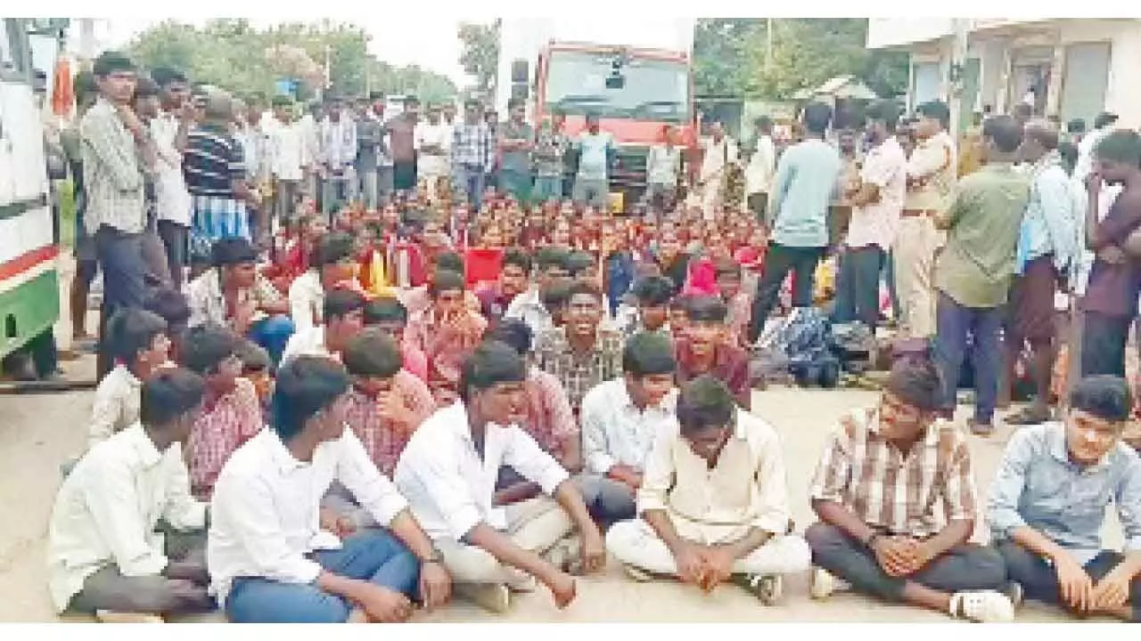 Tension prevailed in Pardipuram village under Aiza Municipality, Alampur Constituency, on Tuesday as students staged a protest by sitting on the road, demanding that RTC buses stop regularly at their stage and that a special bus be arranged during school hours.