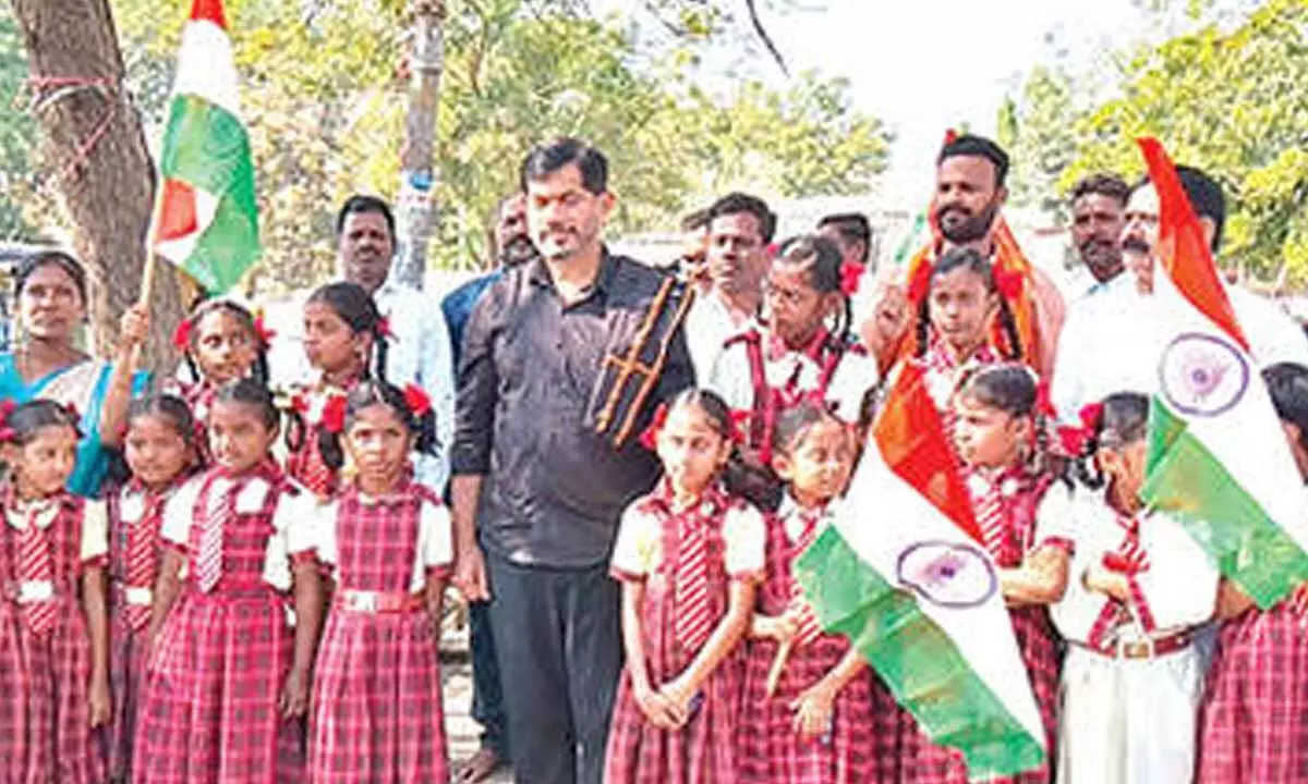 Mancherial: BJPState Vice President Raghunath Verabelli joined school students, teachers, traders, and residents in a collective singing of Vande Mataram at Gandhi Chowk in Luxettipet town on Friday.