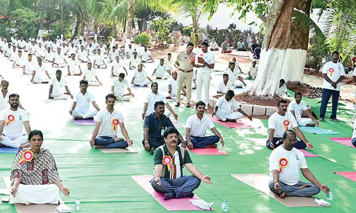 Rajamahendravaram: Amid the serene setting of centuries-old trees, Dutch-era historical structures, and lush gardens, the Rajamahendravaram Central Jail played host to the state-level ‘Yogandhra’ event on Tuesday morning. Bathed in the golden rays of the rising sun, the yoga programme saw the participation of over 1,500 individuals, including 1,300 inmates. Guinness World Record holder KLV Sridhar Reddy led the yoga session, guiding participants through various asanas.