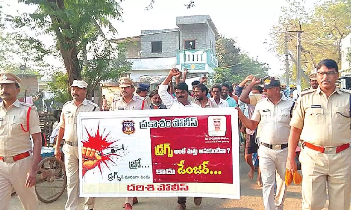 Led by Darsi DSP B Lakshminarayana under the direction of District SP V Harshavardhan Raju, the operation involved 35 police personnel from Talluru, Kurichedu, and Donakonda stations. Using fingerprint identification devices, police checked suspects and conducted door-to-door searches. The operation resulted in the seizure of 44 motorcycles and 2 autos found to be lacking proper documentation and number plates. Owners were issued notices and educated about road safety, drug abuse consequences, cybercrime, new laws, and crimes against women. Subsequently, police organised an anti-drug rally with the slogan ‘Drugs Vaddu Bro’ (Say No to Drugs), mobilising local youth, auto drivers, traders, and residents. Participants in the rally took a pledge to eliminate ganja and drugs from society. The police officials warnedthat drug use destroys individuals, families, and society, urging youth to focus on education, sports, and employment instead.