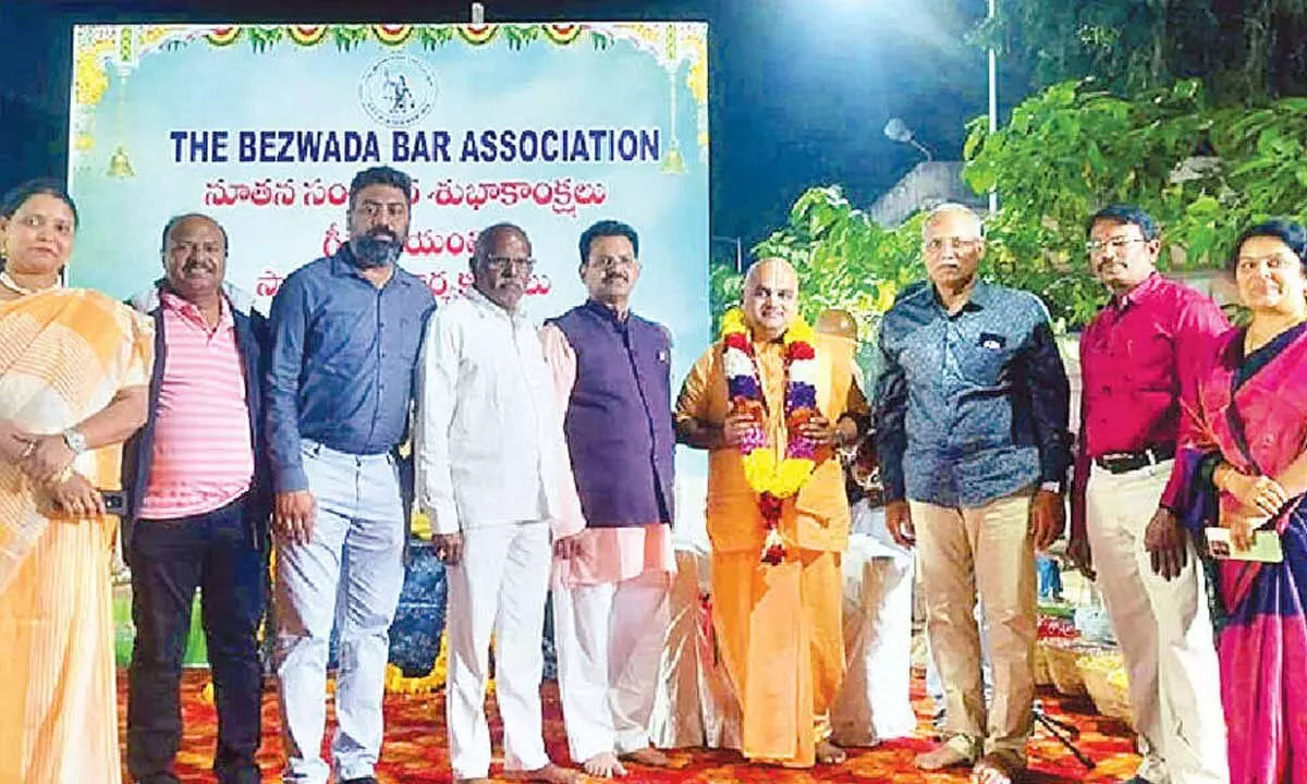 Vijayawada: On the occasion of New Year, grand celebrations were organised at Bezwada Bar Association premises, marked by spiritual fervour and cultural programmes. As part of the celebrations, Chakradhari Dasu from ISKCON Temple, along with his team, graced the event and conducted special prayers in connection with Bhagavad Gita Jayanti.