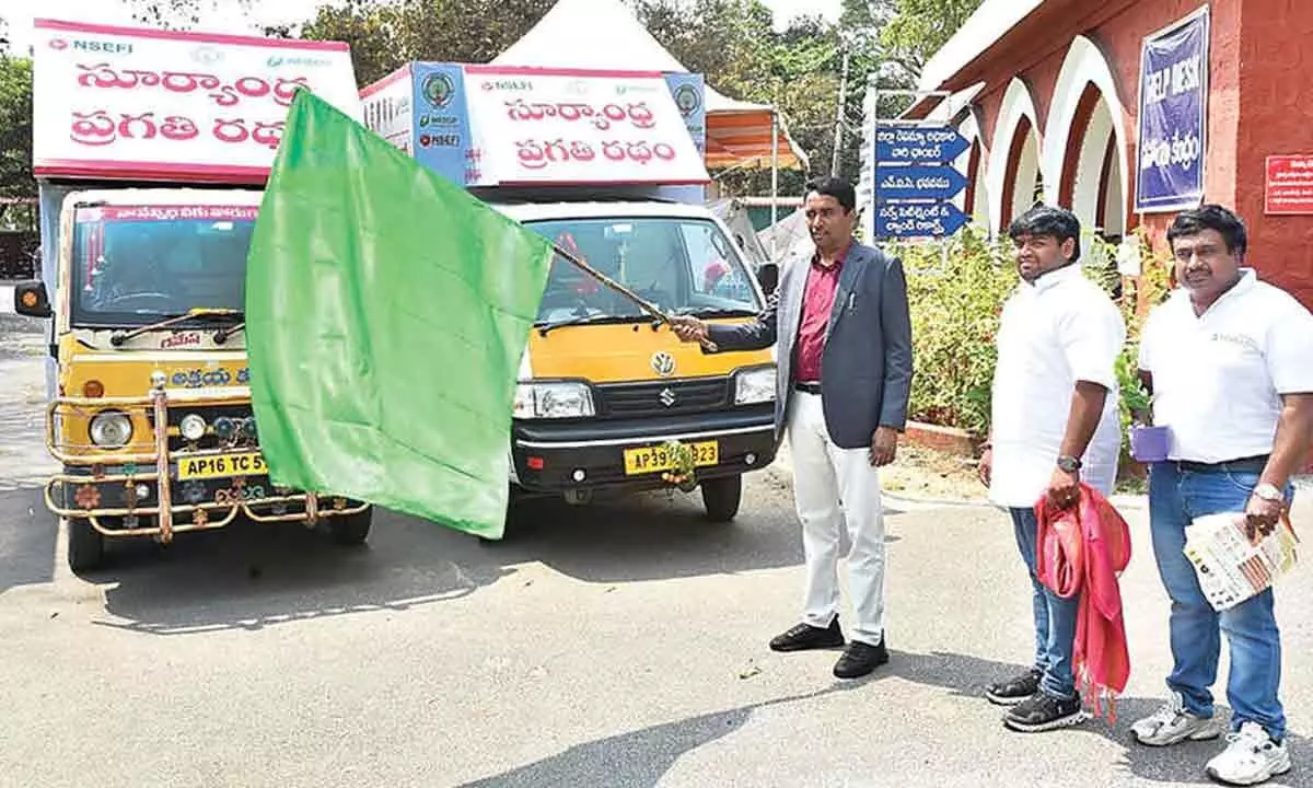 Vijayawada: Calling for greater adoption of solar energy, NTR District Collector Dr G Lakshmisha urged officials and organisations to work towards bringing the benefits of the PM Surya Ghar – Muft Bijli Yojana to every household and promote clean energy usage across the district. To create widespread awareness about the scheme, the Collector on Tuesday flagged off the ‘Suryandhra Pragati Raths’ at the Collectorate in Vijayawada. The campaign is being organised by the National Solar Energy Federation of India (NSEFI) as part of an initiative to popularise rooftop solar systems and encourage people to utilise renewable energy. As part of the initiative, the Suryandhra Pragati Raths will travel across villages and urban areas in the district, educating people about the benefits of the scheme, application procedures, and subsidy details.