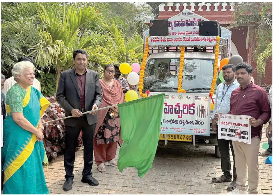 He said transforming NTR district into a model district free from child marriages requires the active participation of every section of society. The collector on Monday flagged off the Vasavya Mahila Mandali (VMM) child marriage-free campaign chariot at the Collectorate in Vijayawada. He also launched a signature campaign against child marriages as part of a large-scale public awareness drive. Speaking on the occasion, Dr Lakshmisha appreciated Vasavya Mahila Mandali for taking up the initiative as part of its social responsibility. Emphasising adherence to laws and regulations, Dr Lakshmisha said society must raise its voice firmly against child marriages. He also suggested that the VMM team aim to collect signatures from over one lakh people through the campaign to further strengthen public participation and awareness. The Collector said the awareness chariot would tour both rural and urban areas of the district to educate people on the adverse effects of child marriages and the legal provisions in place to curb them. He informed that the Child Helpline (1098) and Women Helpline (181) were available for reporting cases and seeking assistance, and urged citizens to make use of these services whenever necessary. Vasavya Mahila Mandali President Dr B Keerthi, Project Director Ramanujaya, District Women and Child Welfare Officer Rukhsana Sultana Begum, DCPU member M Rajeswara Rao and otherswere present.