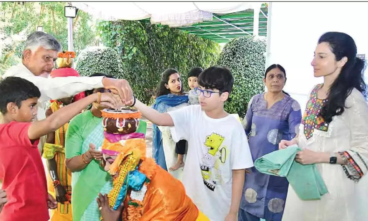 Tirupati: Bhogi was celebrated with great enthusiasm and traditional fervour on Wednesday, with the main attraction being the grand celebrations at Naravaripalle in Tirupati district, where Chief Minister N Chandrababu Naidu participated along with his family. The village wore a festive look as people gathered to witness the Chief Minister taking part in age-old Bhogi rituals, highlighting the cultural richness of the harvest festival.