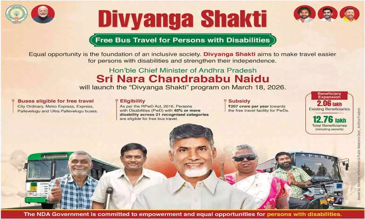 With this expansion, the number of beneficiaries will increase from 1.71 lakh to about 11.16 lakh persons with disabilities. The number of attendants eligible for concession will rise from 33,800 to 1.6 lakh. Overall, the total beneficiaries will grow from 2.05 lakh to about 12.76 lakh. People with disabilities can now travel free on 7,264 buses, which account for about 73 per cent of the APSRTC fleet covered under the Stree Shakti scheme.